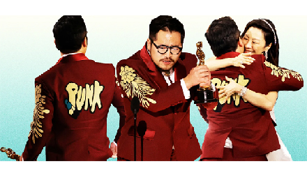 奧斯卡最佳導演關家永穿紅色西服,致敬片中楊紫瓊穿著。