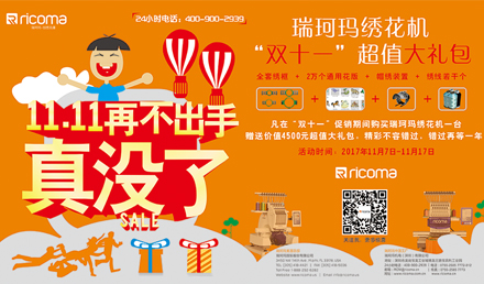 2017-12-27 MORE +瑞珂瑪繡花機“雙11”超值大禮包,等您來拿,凡在“雙11”期間購買瑞珂瑪繡花機一臺,贈送價值4500元大禮包