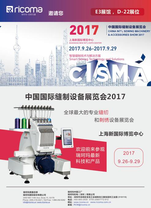 中國國際縫制設備展覽會(CISMA)是全球最大的專業縫制設備展覽會,展品包含了縫前、縫制、縫后各類機器以及CAD/CAM設計系統及面輔,完整地展現了縫制服裝的整個鏈條。該展會憑借宏大規模、優質服務和強大的商貿輻射力贏得了展商和觀眾的贊譽,每兩年舉辦一次,多年以來,瑞珂瑪均攜多款全球領先機型和先進技術亮相展會,獲得全球客戶的青睞。今年更是以300平米的超大展廳,展示多款先進機型,相信會給大家帶來更多的驚喜。