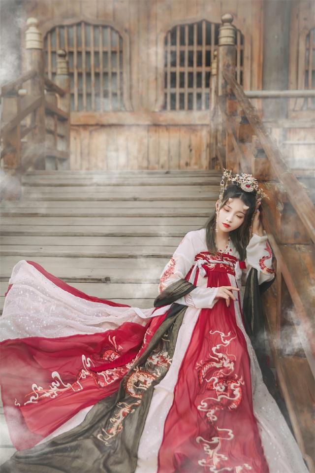 這款漢服重工龍身刺繡,整體造非常飄逸驚艷,它所有的刺繡都是跟龍相關。精美龍紋刺繡,