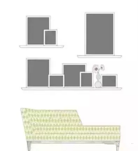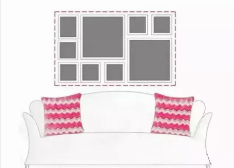 方框線掛法組合出來的裝飾墻,視覺上更加規整,首先需要根據墻面的情況,在腦中勾勒出一個方框,以此為界,在方框中加入組合式或者協調的裝飾畫。