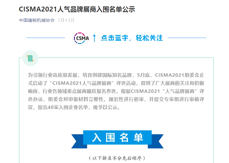 為了傳播品牌價(jià)值,擴(kuò)大品牌影響力,此次展會(huì)還設(shè)置了人氣品牌展商評(píng)選活動(dòng)。經(jīng)企業(yè)申報(bào)、專家組審查評(píng)議,CISMA2021組委會(huì)確定了42家入圍企業(yè),瑞珂瑪機(jī)電(深圳)有限公司成功入選,目前進(jìn)入網(wǎng)路投票階段。