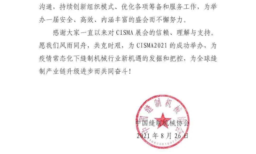 8月26日,中國縫制機械協(xié)會發(fā)布了《關于2021中國國際縫制設備展覽會延期舉辦的通知》,通知指出為保障參展商和觀眾的健康及展會效果,根據(jù)上海市防控部門的建議,經(jīng)慎重研究,原定于2021年9月26日-29日在上海新國際博覽中心舉辦的“2021中國國際縫制設備展覽會(CISMA2021)”將延期至2022年1月7日-10日舉辦。