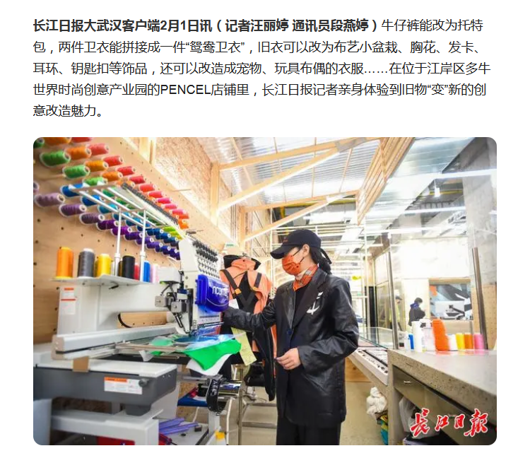 2月1日,長江日報對武漢潮牌店PENCEL進行了報道,對其通過服裝個性化定制方式實現(xiàn)文化及個性表達表示了贊許。在報道中瑞珂瑪繡花機赫然在目。
