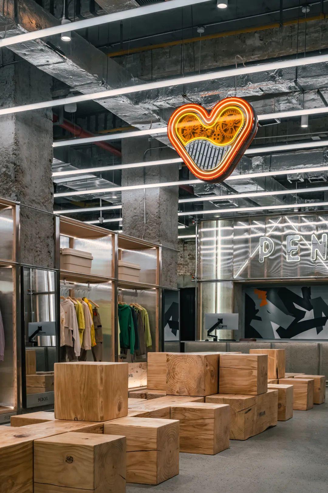 店外到店內(nèi)都充滿了濃郁的設(shè)計感,工業(yè)與自然為一體的室內(nèi)空間,采用木頭,陽光板和鋼構(gòu)件,營造出室內(nèi)戶外市集的感覺。
