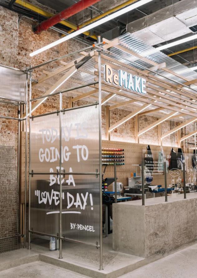 PENCEL的原創(chuàng)服裝大多采用撞色、撞料設(shè)計,大部分衣服可拆卸,實現(xiàn)“一衣多穿”。顧客不僅可以在店內(nèi)選購衣服,還可以在專門設(shè)置的手作區(qū)——Re Make,進行靈感的創(chuàng)作,你可以完全根據(jù)自己的喜好或一瞬間的idea打造屬于你的定制款。