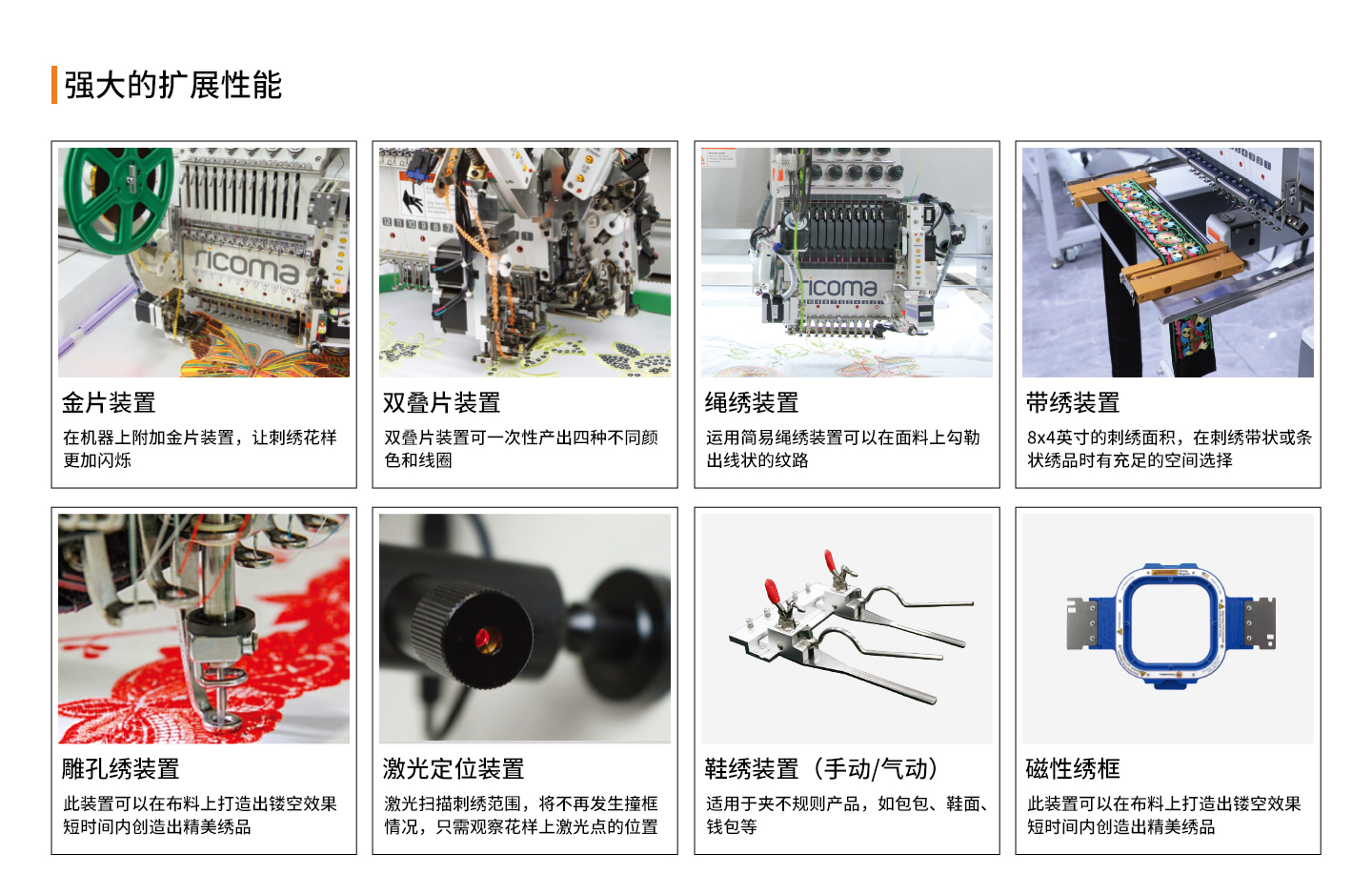 ▼ 方便加裝選配裝置,如金片繡,繩繡和雕孔繡裝置;
